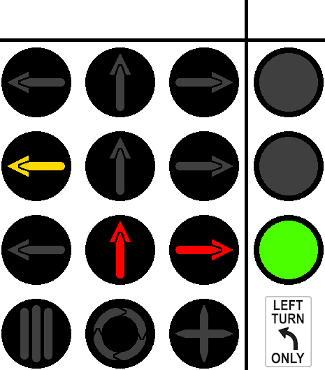 This is for "right lane must turn" lanes. For left lanes, flip the left and right signals.